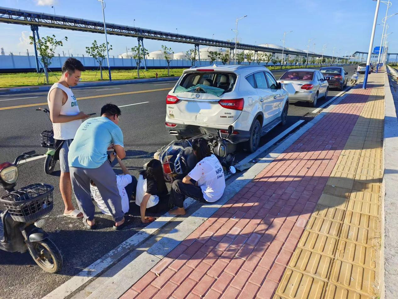 近日,在大南海石化工業區環海南路發生一起交通事故,兩位年輕人的暖心行為引起了廣泛關注。據了解,7月24日下午15時許,一輛電動摩托車撞上了停放在路邊的小汽車,三位女孩受傷,其中,兩名女孩傷勢嚴重,躺在地上無法動彈。就在這時,兩位年輕人跑了過來,向其中一位傷勢較輕的女孩了解具體情況,對另外兩位女孩子進行安撫陪伴,并聯系小汽車車主。此時,另一位好心市民也跑過來幫忙,撥打了110和120。兩位年輕人一直陪伴在三位女孩身邊,直至救護車將她們送到醫院治療才離去。