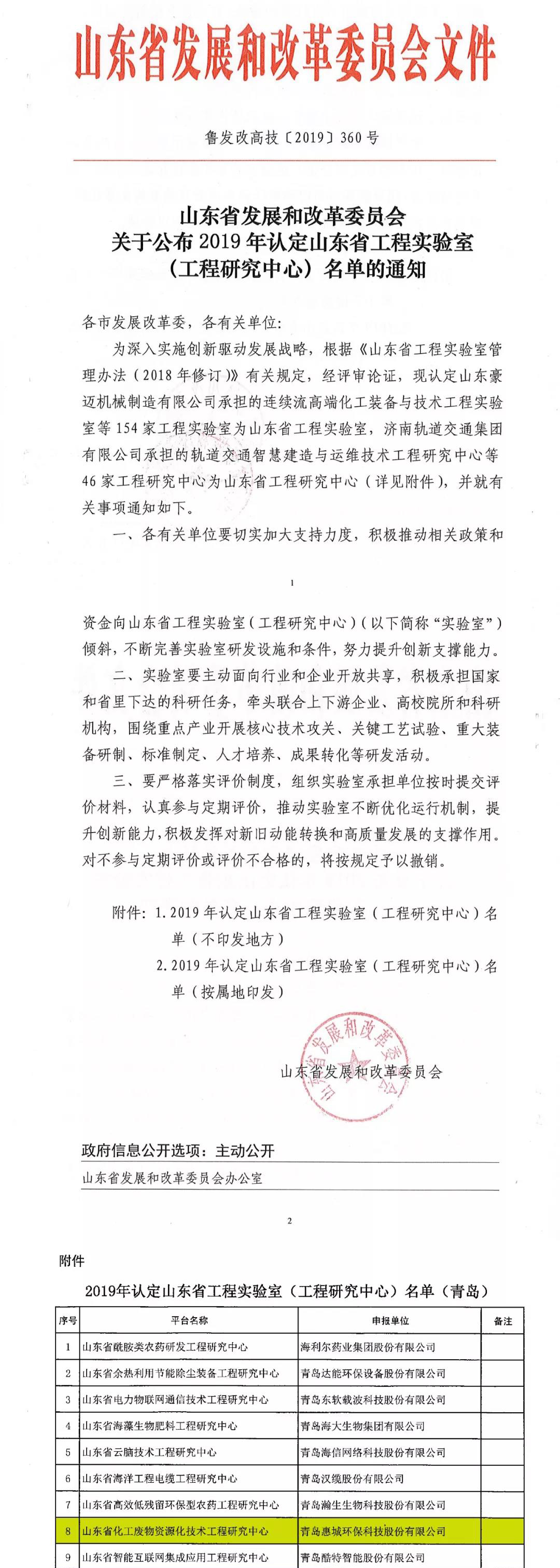 日前,根據(jù)山東省發(fā)展和改革委《關(guān)于公布2019年認(rèn)定山東省工程實(shí)驗(yàn)室(工程研究中心)名單的通知》(魯發(fā)改高技〔2019〕360號(hào))發(fā)布文件,我公司申報(bào)的省級(jí)工程研究中心獲批并被認(rèn)定為山東省化工廢物資源化技術(shù)工程研究中心。
