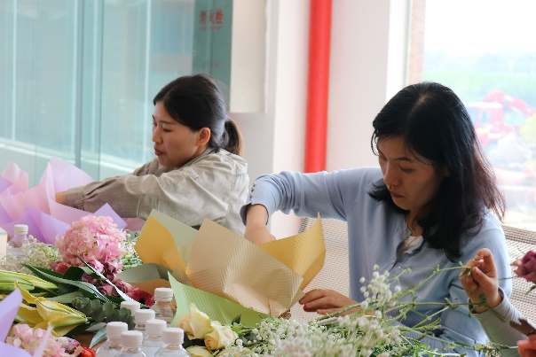 在由玫瑰花、洋桔梗、繡球花、百合、滿天星之香氣調(diào)和而成的陣陣馨香中,花藝師向女職工們講解插花知識,介紹花材的名稱、養(yǎng)護(hù)方案、花材的處理和修剪方法,示范插花步驟,女職工們聚精會神地學(xué)習(xí)后認(rèn)真設(shè)計(jì)自己的花籃,相互討論,時不時迸發(fā)出爽朗的笑聲,經(jīng)過精心設(shè)計(jì),一個個形態(tài)飽滿、充滿生命力的花籃就誕生了,大家紛紛拿出手機(jī),記錄下這美好的時刻。